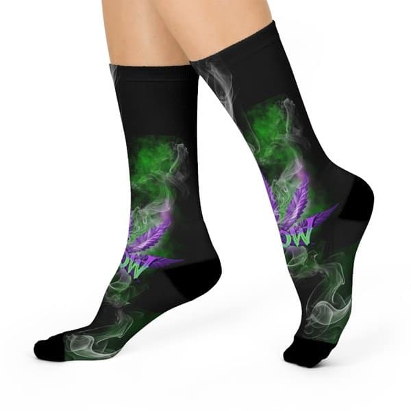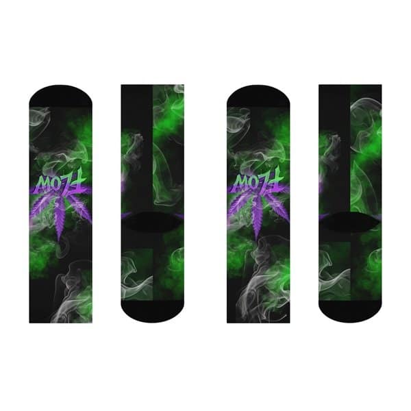 Step into your flow with these vibrant Cannabis Flow socks. Featuring a mesmerizing design of a purple and green cannabis leaf surrounded by swirling smoke and the electric FLOW lettering, these socks are a wearable piece of psychedelic art. Made for comfort and style, they’re the perfect way to express your free spirit and connect with the cosmic rhythm in every step.