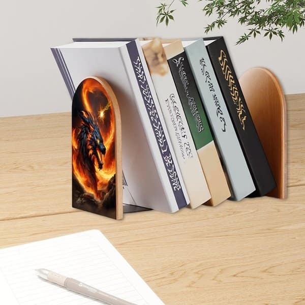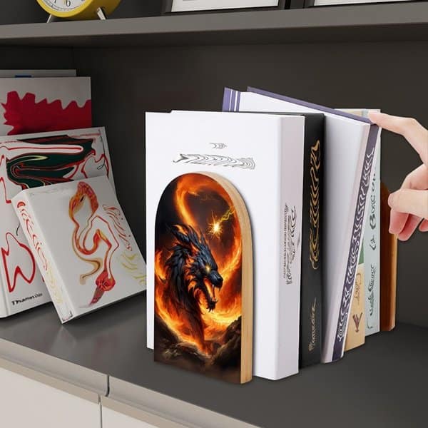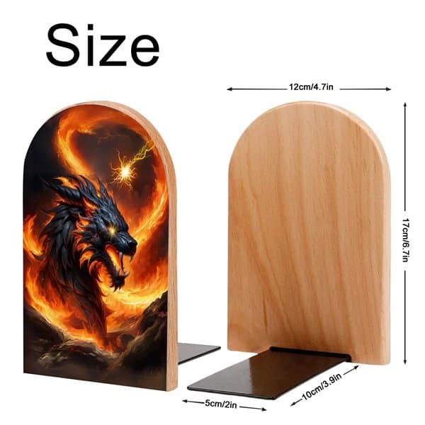 These Fiery Dragon I bookends seamlessly blend the warmth of natural beech wood with the strength of iron, creating a stylish and functional addition to any room. The single-sided printing area allows you to personalize them with unique designs, adding a personal touch to your décor. Utilizing advanced UV printing techniques, your chosen design will be vibrant and long-lasting. The combination of wood and metal introduces a relaxed and natural aesthetic to your study room, bookshelf, office, classroom, or library.
