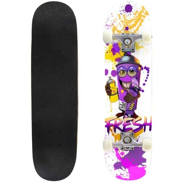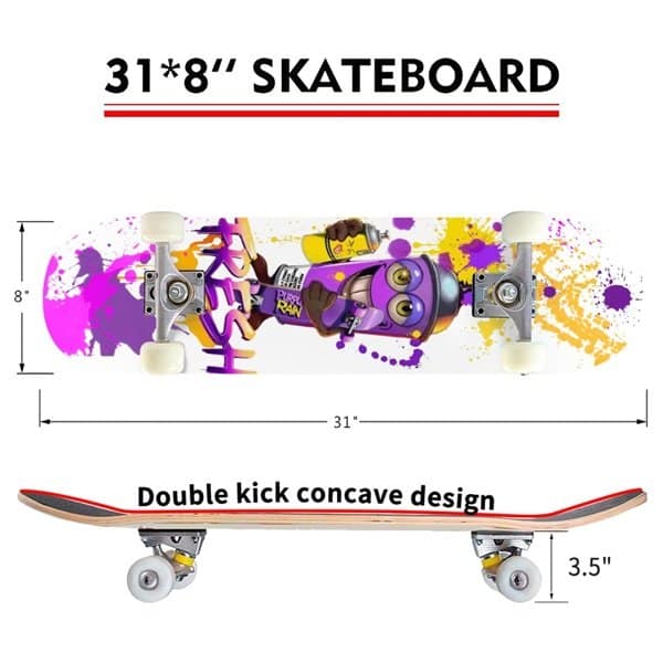This skateboard features durable PU wheels and stainless alloy bearings. Enjoy long-lasting glide and reliable performance. The deck is constructed from 7 layers of high-density maple wood. This provides a stable and powerful grip, thanks to the emery non-slip surface. The 31.0″ x 8.0″ size and double kick concave design are ideal for performing tricks with ease. It’s the perfect combination of exercise and pure fun. Take it to the street, skate park, ramp, or pool. It handles smooth surfaces and even rougher ground. This board is totally portable, ready for your next adventure. It arrives fully assembled, so you can start riding right away.