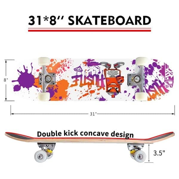 This skateboard features durable PU wheels and stainless alloy bearings. Enjoy long-lasting glide and reliable performance. The deck is constructed from 7 layers of high-density maple wood. This provides a stable and powerful grip, thanks to the emery non-slip surface. The 31.0″ x 8.0″ size and double kick concave design are ideal for performing tricks with ease. It’s the perfect combination of exercise and pure fun. Take it to the street, skate park, ramp, or pool. It handles smooth surfaces and even rougher ground. This board is totally portable, ready for your next adventure. It arrives fully assembled, so you can start riding right away.