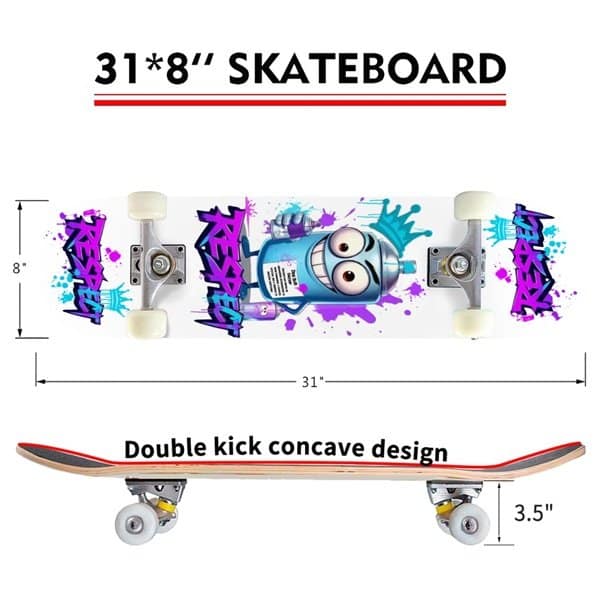 This skateboard features durable PU wheels and stainless alloy bearings. Enjoy long-lasting glide and reliable performance. The deck is constructed from 7 layers of high-density maple wood. This provides a stable and powerful grip, thanks to the emery non-slip surface. The 31.0″ x 8.0″ size and double kick concave design are ideal for performing tricks with ease. It’s the perfect combination of exercise and pure fun. Take it to the street, skate park, ramp, or pool. It handles smooth surfaces and even rougher ground. This board is totally portable, ready for your next adventure. It arrives fully assembled, so you can start riding right away.