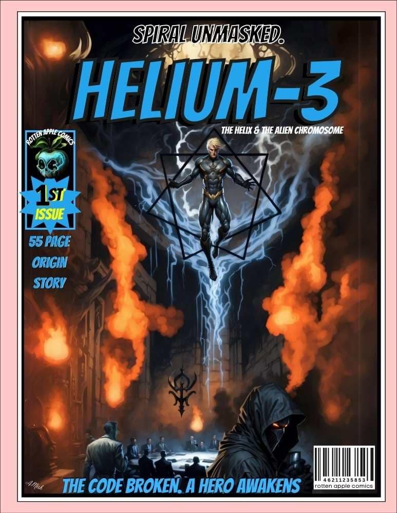 This captivating digital comic book spans 55 action-packed pages. Created by the visionary storytellers at Rotten Apple Arts LLC, Helium-3 is a pulse-pounding sci-fi adventure. It masterfully blends the dark intrigue of cyberpunk with a compelling cosmic mystery. Prepare to be drawn into a world of advanced technology and ancient secrets. Download your PDF copy today. Immerse yourself fully in the intricate narrative and stunning visuals of Helium-3: The Helix and the Alien Chromosome: Spiral Unmasked Issue 1.