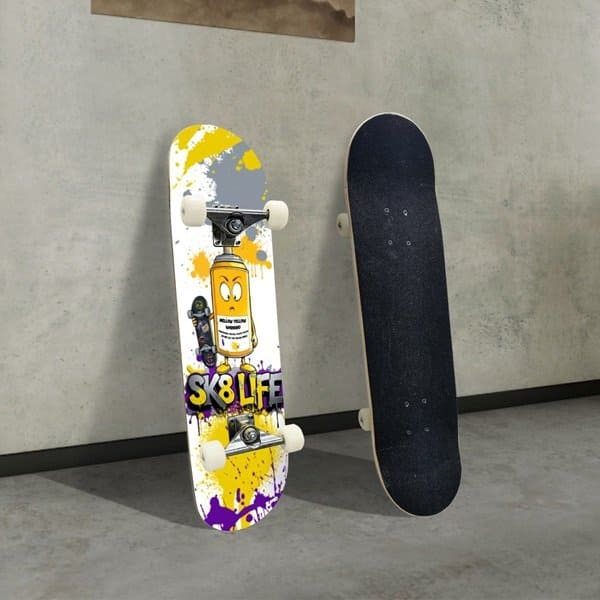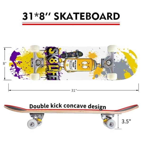 This Sk8 Life skateboard features durable PU wheels and stainless alloy bearings. Enjoy long-lasting glide and reliable performance. The deck is constructed from 7 layers of high-density maple wood. This provides a stable and powerful grip, thanks to the emery non-slip surface. The 31.0″ x 8.0″ size and double kick concave design are ideal for performing tricks with ease. It’s the perfect combination of exercise and pure fun. Take it to the street, skate park, ramp, or pool. It handles smooth surfaces and even rougher ground. This board is totally portable, ready for your next adventure. It arrives fully assembled, so you can start riding right away.