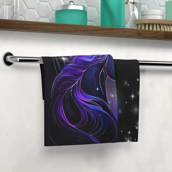 This Cosmic Horse Face Towel is a magical and vibrant addition to your bathroom decor. Perfect for horse lovers and those who enjoy cosmic and unicorn designs. Ideal for use in the spa or as a gift.