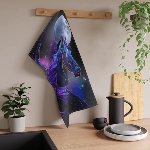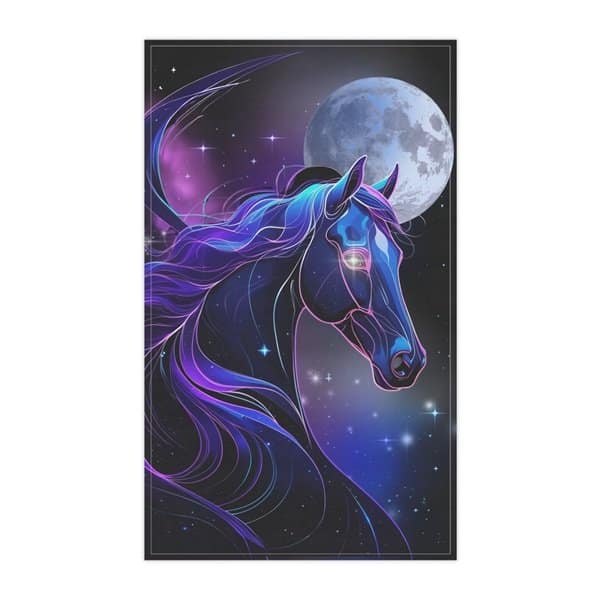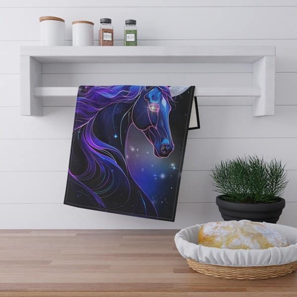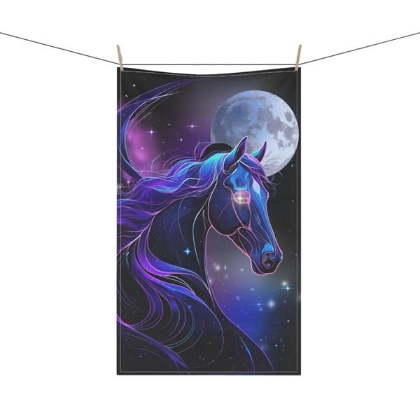 Elevate your bathroom or kitchen decor with this stunning hand towel. Featuring a vibrant, celestial design of a majestic horse against a moonlit background, it brings a touch of mystical charm. The soft, lightweight fabric is perfect for quick drying, making it a practical yet stylish addition to your home. Ideal for horse lovers, art enthusiasts, or anyone who loves unique decor, this towel fits seamlessly into your daily routine. Use it to add flair to your space during holidays, family gatherings, or simply as a delightful everyday essential.