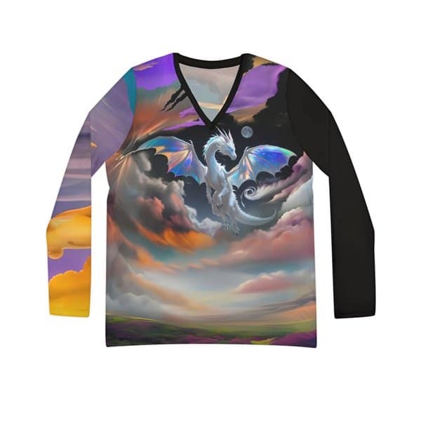 This Spirit Iridescent Dragon V-Neck Long Sleeve Shirt is a unique and eye-catching addition to any Fantasy lover’s wardrobe. Made from super soft and lightweight polyester-spandex blend, this shirt is perfect for leisure or activewear. The double needle stitching ensures durability and longevity, while the size and care label printed inside the collar adds convenience. Seam thread color is automatically matched to the design for a cohesive look. Assembled in the USA, this shirt is a great gift for fans of Fantasy art.