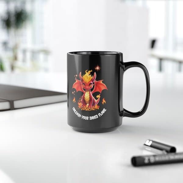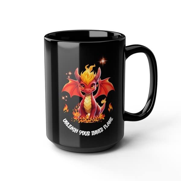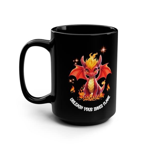 Introducing a striking black mug that radiates charm and personality. Perfect for sipping your favorite beverages, this 15oz glossy ceramic mug adds a touch of whimsy to your morning routine. The vibrant dragon design invites you to unleash your inner fire while enjoying coffee, tea, or hot chocolate. Ideal for those who appreciate a unique and fun touch in their kitchen or office. This mug is not only versatile enough for everyday use but also makes a fantastic gift for anime lovers, fantasy fans, or anyone who values expressive drinkware. Celebrate occasions like birthdays, holidays, or simply treat yourself or a loved one to a daily dose of inspiration. Microwave and dishwasher-safe, this mug is as practical as it is playful, designed to fit into your life effortlessly.