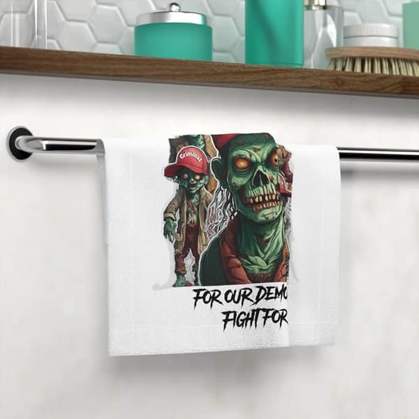 Start and end your day with a powerful reminder to defend democracy with our Winter is Coming… for our democracy. Fight for it! Face Towel in a stark white. Featuring a compelling artwork of zombie-like figures in MAZA hats, symbolizing the threat to democratic values, alongside a clear call to action. Crafted from a gentle and absorbent fabric, this face towel brings a touch of political awareness to your daily routine. Let every use reinforce your commitment to the cause. Fight for democracy, from the start.