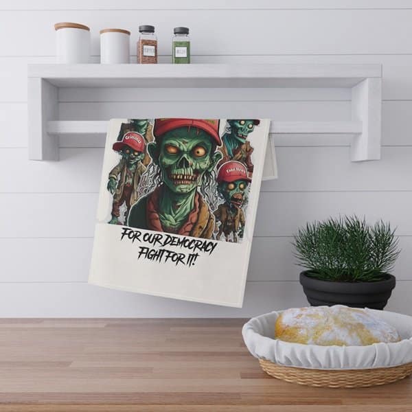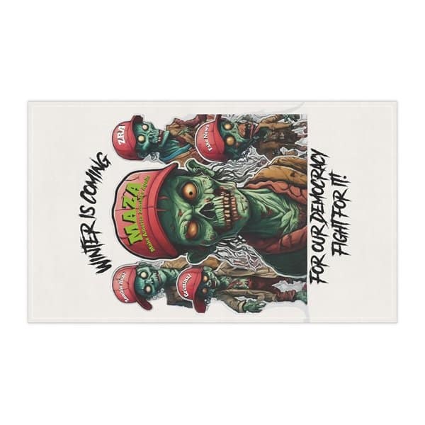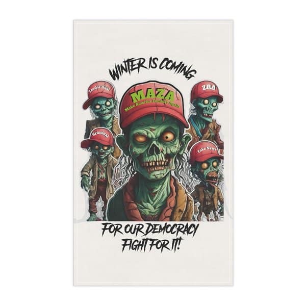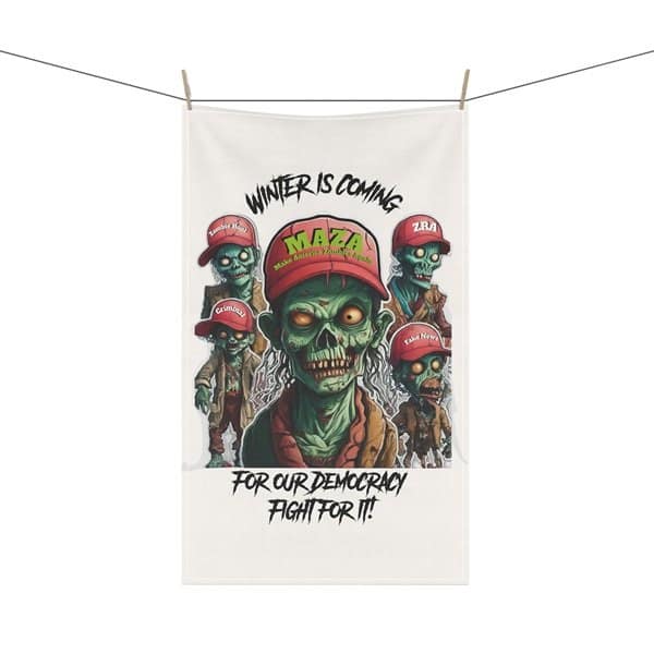 Dry your hands with a firm stance for democracy with our Winter is Coming white hand towel… for our democracy. Fight for it! Featuring the impactful artwork of zombie-like figures in MAZA hats, symbolizing the threat to democratic values, alongside a clear call to action. Crafted from soft and highly absorbent fabric, this hand towel brings a touch of political conviction to your bathroom or kitchen. Let every use reinforce your commitment to the fight. Defend democracy, even in the small moments.