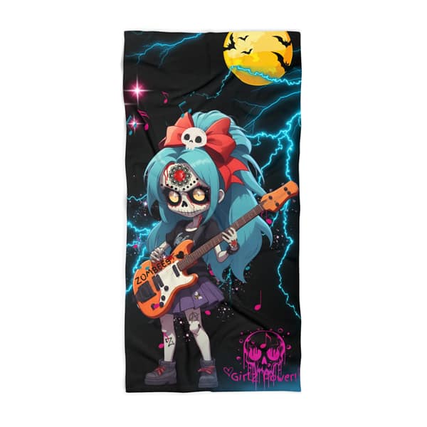 Vibrant Bass Guitarist Sugar Skull design by Luzi Flores for the band The Zombees, perfect for music lovers and beach-goers. This Beach Towel is a must-have for summer concerts, music festivals, and days spent lounging by the water.