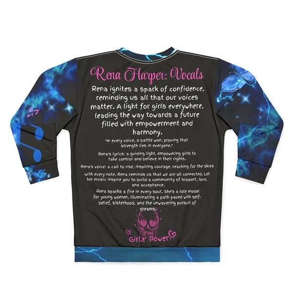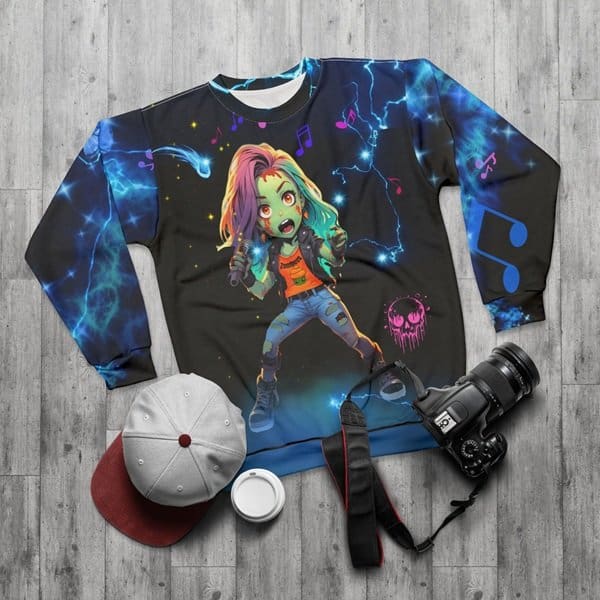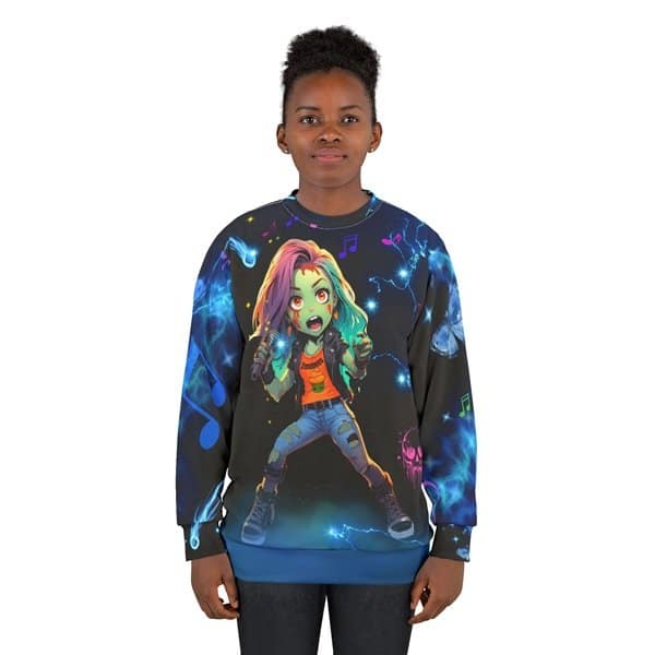 This Sweatshirt features a design of Rena Harper, the lead vocalist of the GirlZ Band The Zombees, a beautiful Zombie girl, with blue lightning and a Comet in background, telling a story of her journey through life as a Zombie. The bright and intense colors of the all-over design make a statement for fans of the band and zombie enthusiasts. Perfect for those who love unique and edgy fashion, this Sweatshirt is great for casual wear or as a statement piece for concerts, Halloween parties, and music festivals.